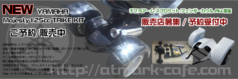 Tel 直通 090-3476-0958 24h対応 / 非通知不可です Tel 0263-71-3717 11:30〜16:00/18:00〜24:00/日曜休 mail... shop@atmark-cafe.com 業販OK 新車ベース完成車 Majsty 125 Trike YAMAHA マジェスティ125cc/250cc トライクキット 販売店/取扱店/取次店をご希望のShop様は... 業種問わず/車両在庫不要/ノルマなし/初期投資ゼロ 詳しい業務内容他、お取引条件等詳細は お気軽にお問い合わせください。 |