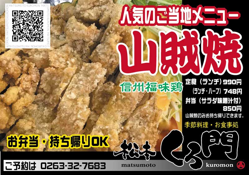 まつもと 松本市 長野県 中町 松本城 松本城周辺 松本駅近く イオンモール 松本パルコ くろ門 くろもん 黒門 宴会 会食 ランチ 持ち帰り 持帰り テイクアウト 弁当 季節料理 山賊焼 海鮮料理 居酒屋 刺身 焼き魚 とんかつ カツ丼 カレー 天ぷら 鍋 鍋料理 地元 ご当地 牡蠣 馬刺し きのこ 地酒