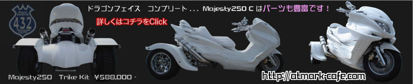 ご購入の際には納車・修理等アフターまで安心できるSHOP様をお選びいただきご購入ください。 試乗車/展示場/整備ブースがある販売店様からのご購入をオススメ致します。 マジェスティ250トライクKit...発売中! ![]() ![]() ![]() Majesty250Trike Kit お待たせいたしました...ついに完成!フェンダーの形状が開発段階で変更が〜 リア左右中央カウルを一体化し更にスタイリッシュに! リア左右フェンダー後方には専用LEDテールランプも準備しております。(OP)。 パーキングブレーキも純正そのままでOK!バッチリ使用できます。 パワーに余裕のある250ccで高速走行やロングツーリングもGood!...より快適性を高めたKITです。